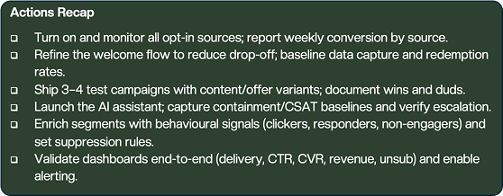 Launch and measure success of opt-in sources and the different campaigns, iterate each week.